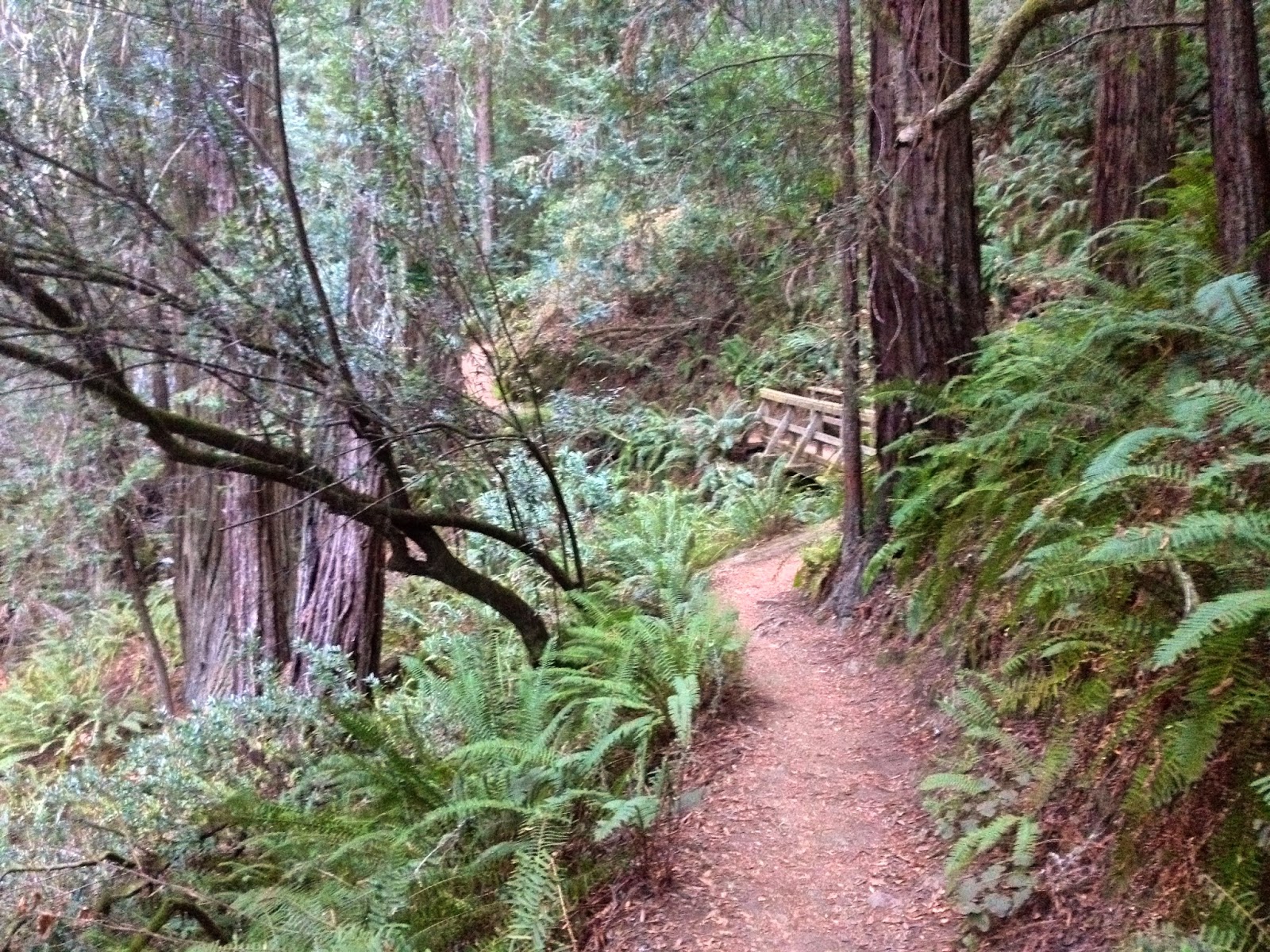 The next part was a lot of fun. The very long slow climb up the Coastal View/Heather Cutoff trails from my training run a couple weeks back was now a long slightly downhill stretch perfect for running fast. I made up a lot of ground here, dropping below seven mins/mile a few times, which I surprised myself with, given that the trail gets quite rocky in places. I passed a number of people here. Getting to the Heather Switchbacks, I kept the speed up, just kind of dancing down the hill. It was warm and sunny and I was having fun. At the bottom of the hill, I crossed the horse field/bridge, and ran most of the Redwood Creek trail, a very gradual uphill section, to the next aid station. Checked in here, had a lot more water, a quick chat, and a quick snack, and started the next climb.